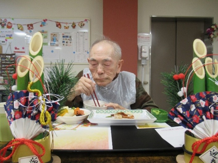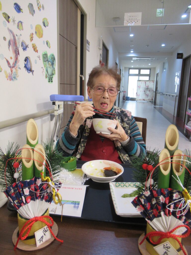 昼食は、一年の幸せを願う縁起物である 門松 を飾り「赤飯」を召し上がっていただきました。